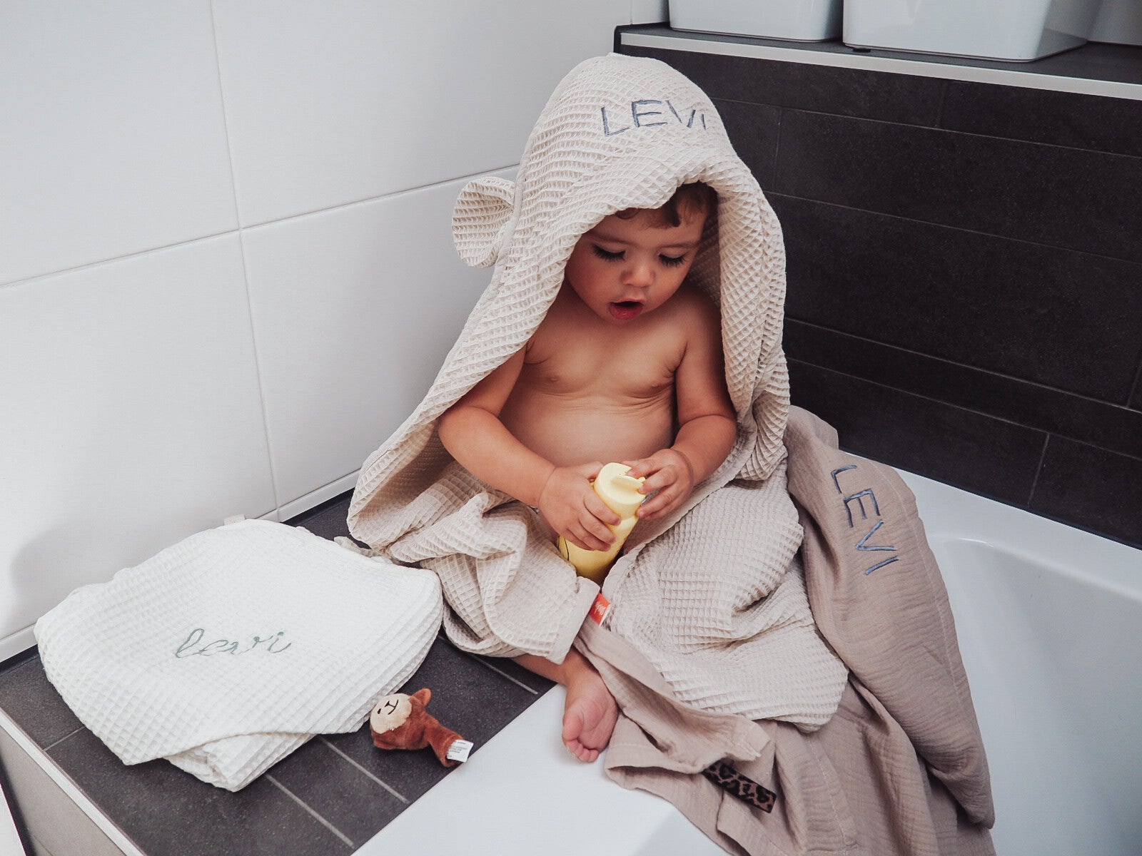 Of je nu kiest voor off-white of zand, elke badcape is handgemaakt en geborduurd met de naam van je kindje. Perfect om te geven of te koesteren.