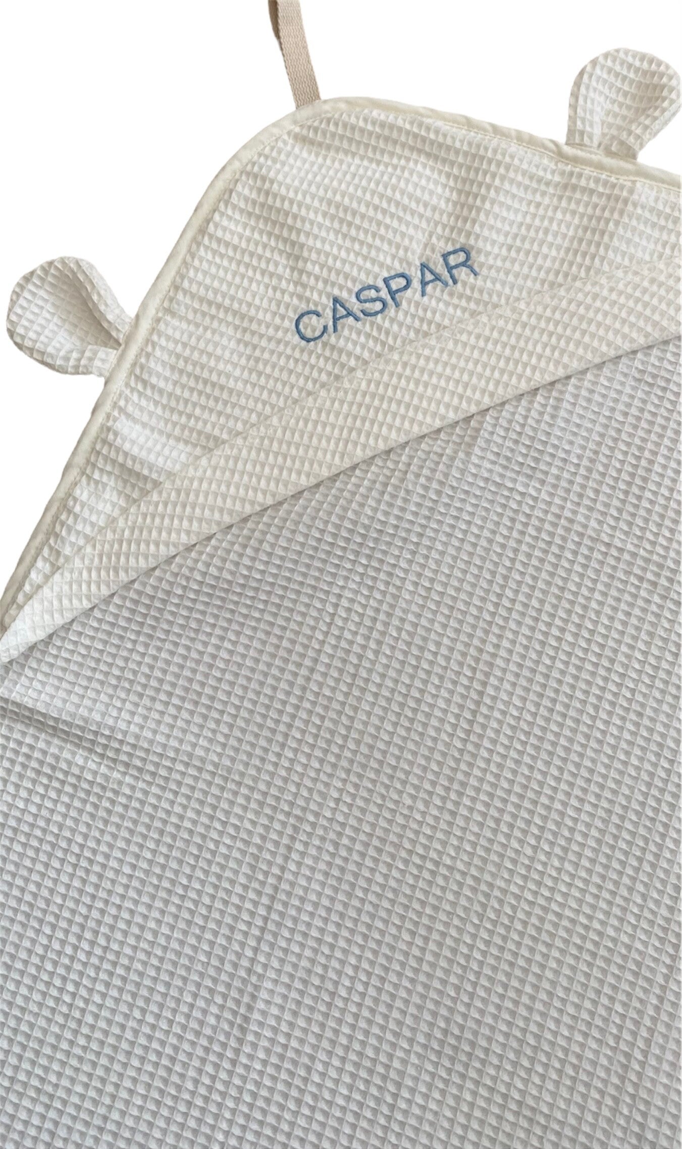 Laat je kleintje heerlijk wegkruipen na het bad met onze grote, handgemaakte badcape met berenoortjes. Personaliseer met de naam van je kindje en maak het een onvergetelijk item.