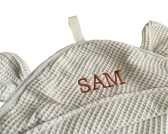 Of je nu kiest voor off-white of zand, elke badcape is handgemaakt en geborduurd met de naam van je kindje. Perfect om te geven of te koesteren.