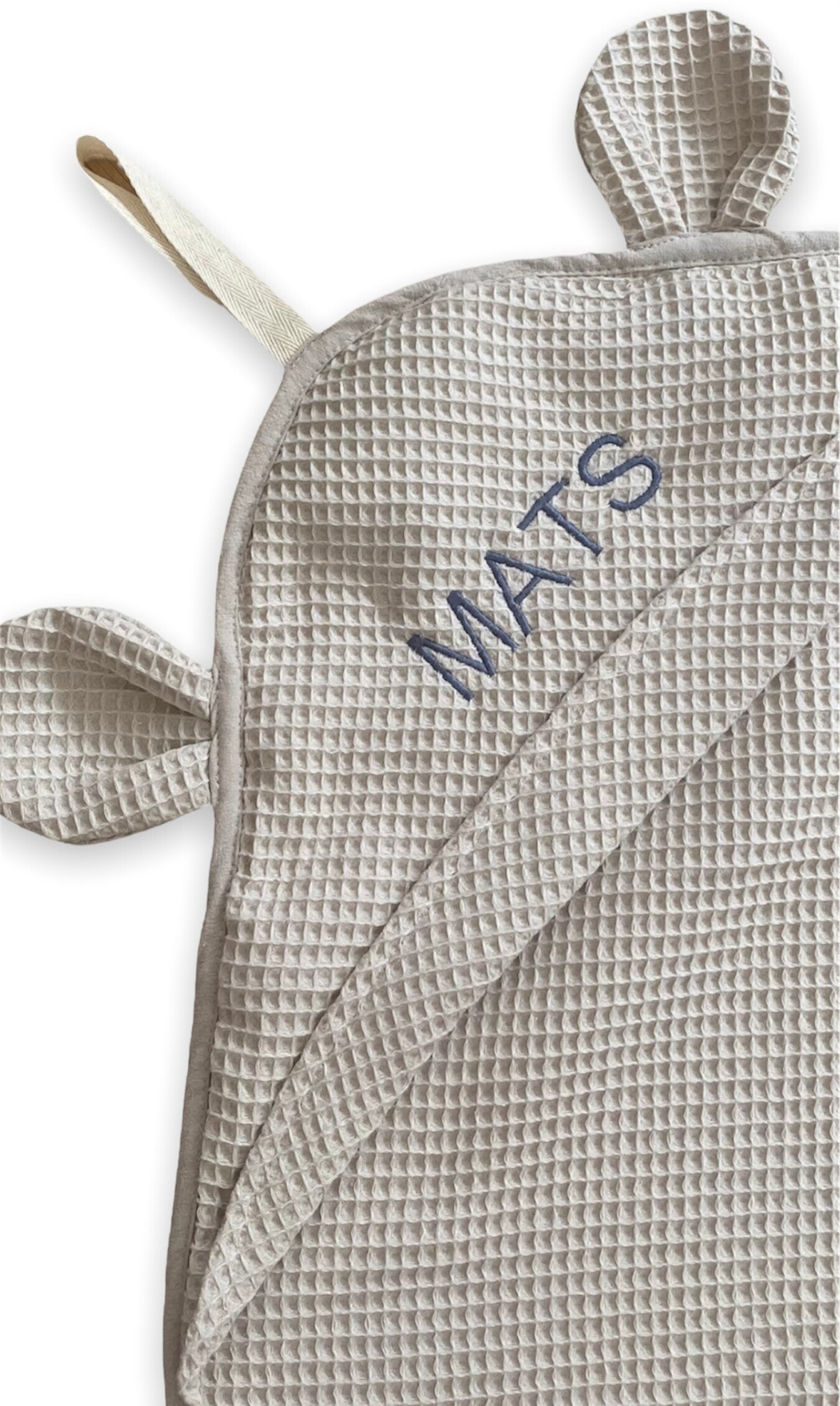 Maak van elk badmoment een knus ritueel met onze handgemaakte XXL badcape van luxe wafelkatoen. Deze grote cape wordt gepersonaliseerd met de naam van jouw kleintje in een stoer, eigentijds lettertype. Dankzij de zachte, ademende stof is hij niet alleen comfortabel, maar ook sneldrogend en superabsorberend – ideaal voor dagelijks gebruik.